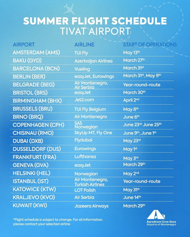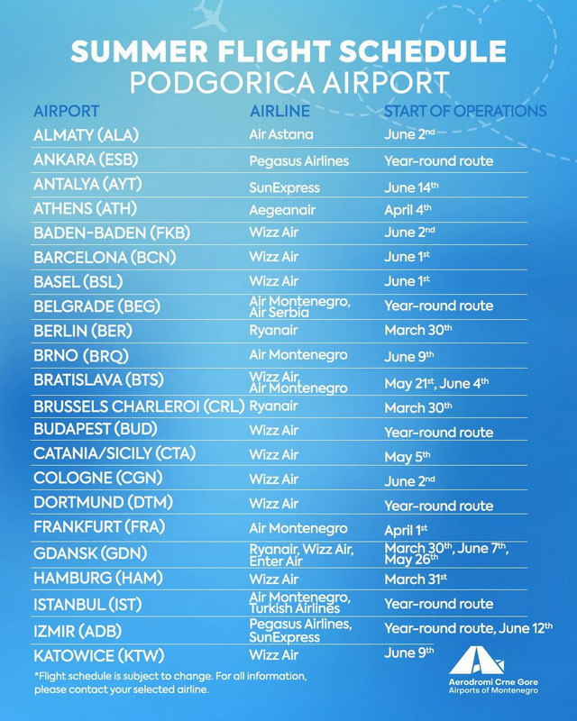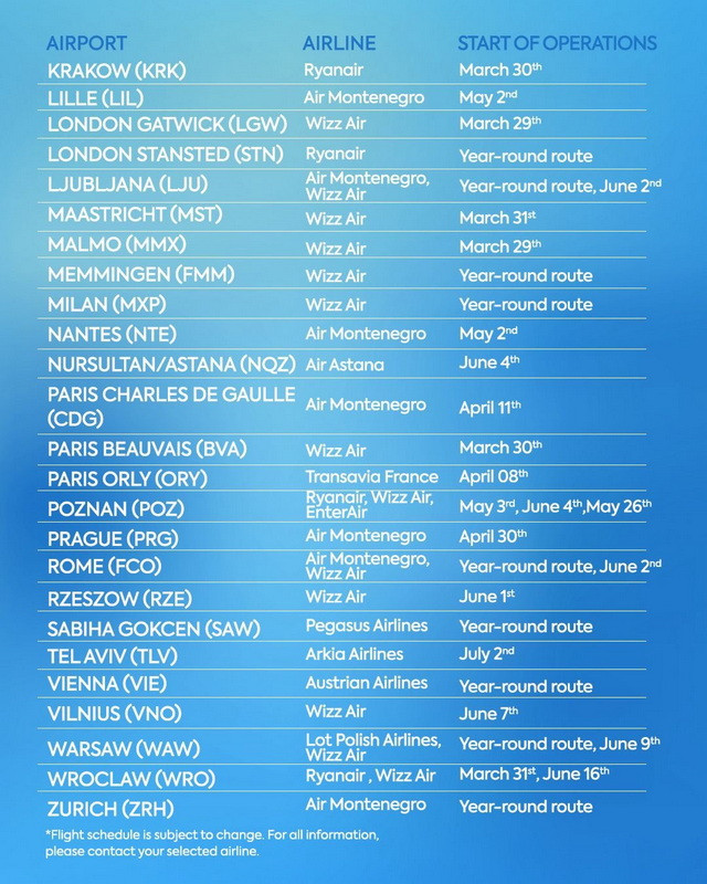 Both Podgorica Airport (TGD) and Tivat Airport (TIV) will offer a mix of year-round and seasonal flights, including many new low-cost routes and several new airline entries.