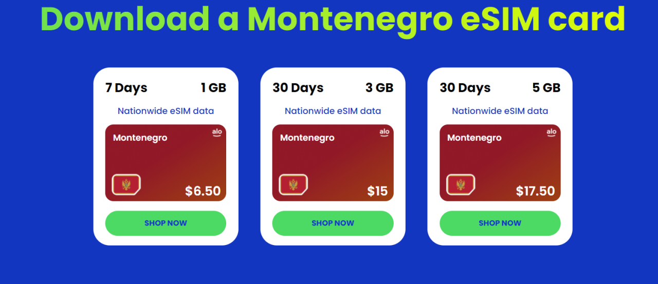 Alosim, a rapidly growing eSIM store with competitively priced eSIMs, has two eSIMs covering Montenegro: