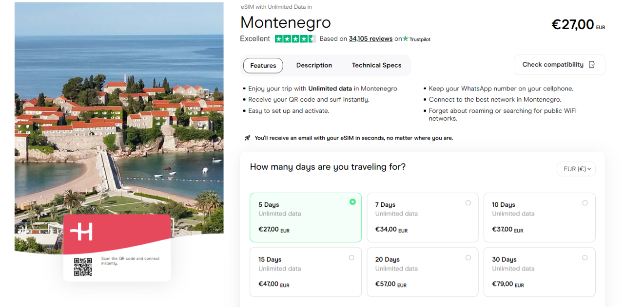 Holafly is known for its unlimited data eSIM offering, which it introduced in June 2022 and has been expanded to about 100 countries since. It has only one eSIM covering Montenegro: